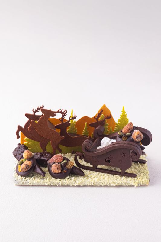 Montage chocolat noir, décoration trio de chocolat garni de Délices de Jade, orangettes et crocs télé