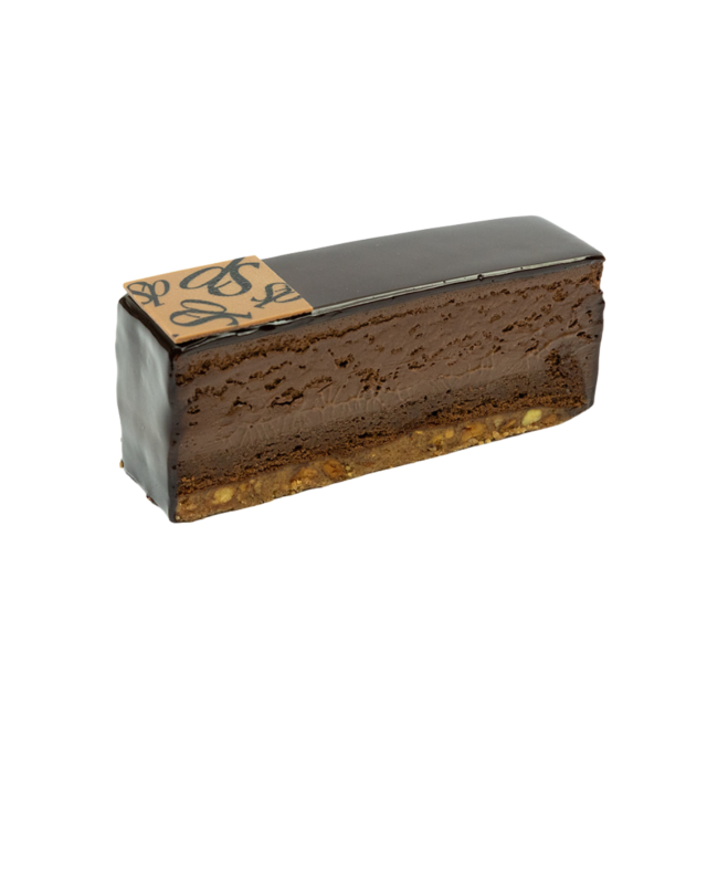 Biscuit et crémeux chocolat, croustillant aux noix de Pécan, mousse au chocolat noir St Domingue 70 %