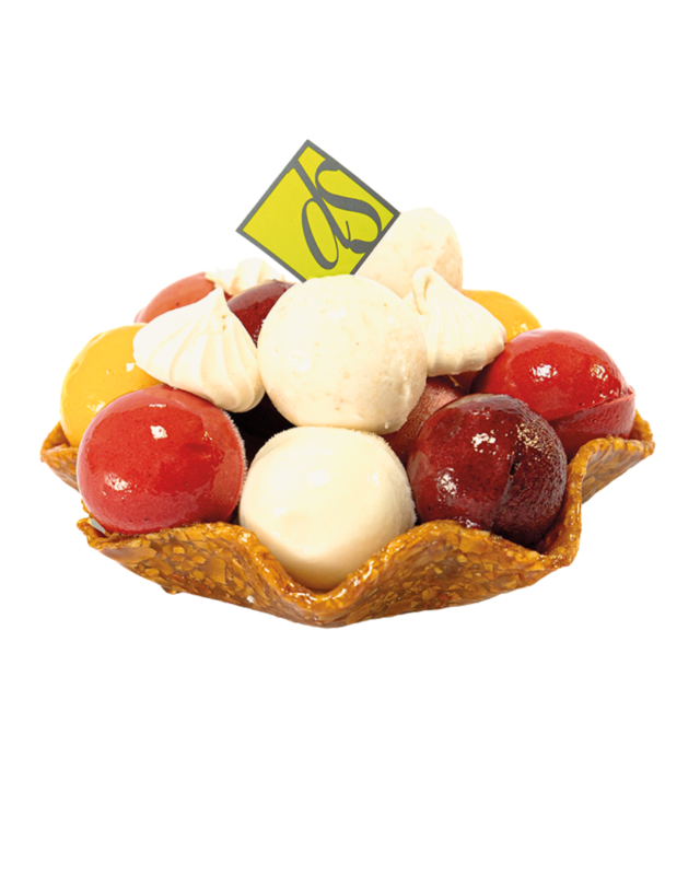 Corbeille en nougatine croquante garnie d'un parfait glacé praliné noisette et d'un