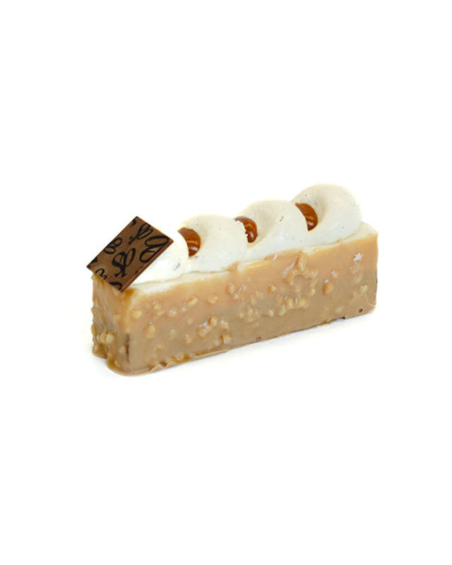 Une pâte sablée à l'amande avec un croustillant crumble, des noix de pécan caramélisées, du caramel au beurre salée, une mousse vanille et une ganache montée vanille.
