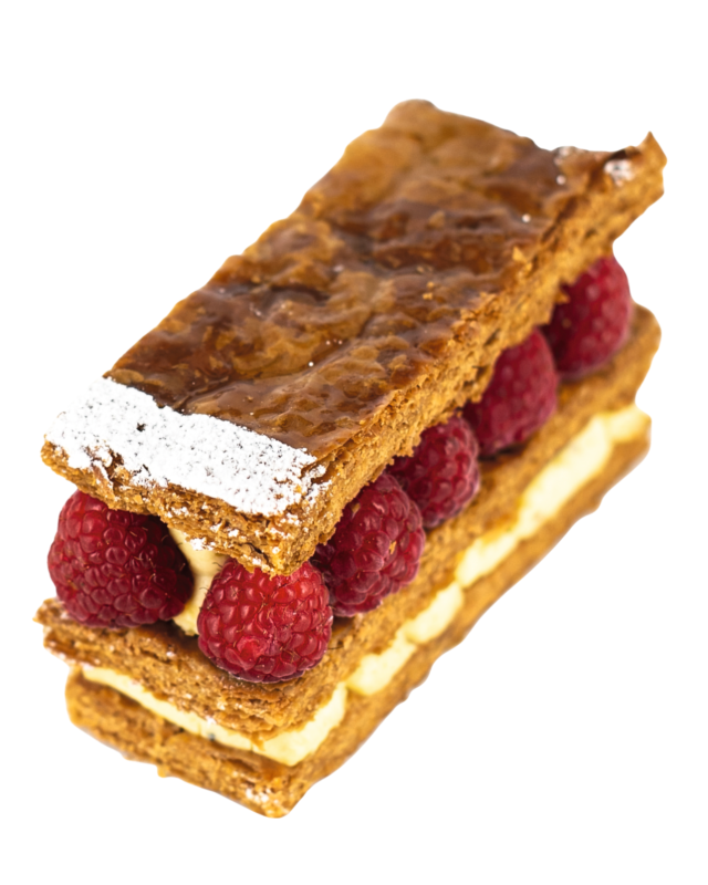 Pâte feuilletée finement caramélisée, crème montée légère vanille de Madagascar, framboises fraîches